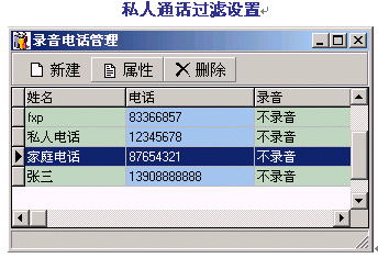 。。通過對某些特殊電話號碼的禁止錄音設(shè)置,DVS將自動過濾該號碼進(jìn)行不錄音處理,以滿足私人通話及特殊場合的需要。