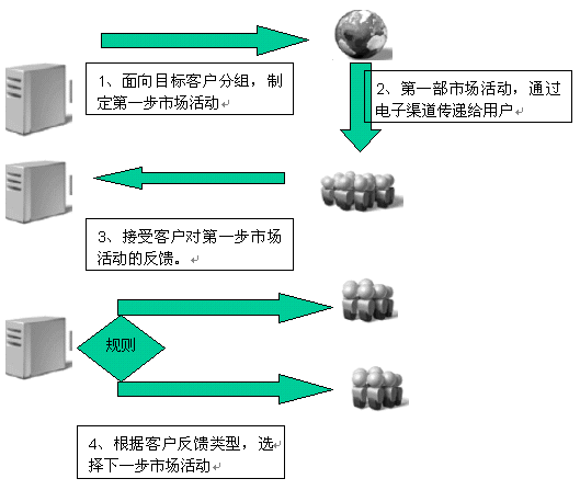 電子化營(yíng)銷(xiāo)過(guò)程,是通常是多步驟市場(chǎng)活動(dòng)。每個(gè)步驟完成一定的工作,下一步的市場(chǎng)活動(dòng)將根據(jù)客戶(hù)對(duì)市場(chǎng)活動(dòng)的反饋和內(nèi)置的市場(chǎng)活動(dòng)的規(guī)則進(jìn)行選擇。而且每個(gè)步驟客戶(hù)市場(chǎng)活動(dòng)的反饋,都由電子化營(yíng)銷(xiāo)系統(tǒng)中的反饋處理系統(tǒng)集中到CRM系統(tǒng)中。從而為市場(chǎng)活動(dòng)效果評(píng)估,提供數(shù)據(jù)上的支持。