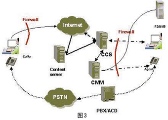----圖2說明了在集成互聯(lián)網(wǎng)電話網(wǎng)關(guān)時進(jìn)行協(xié)同會話的流程,圖中實線為數(shù)據(jù)信息傳遞的鏈路,虛線為語音傳遞的鏈路。通過ITG和PBX/ACD 的特定交互接口,將呼叫中心外部的IP電話鏈路集成到CCIS系統(tǒng)中。值得注意的是,ITG 和CCS需要安裝在企業(yè)防火墻的外側(cè),以方便呼叫者的訪問。
