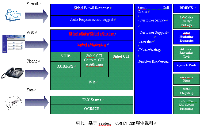 電子商務(wù)網(wǎng)站的運(yùn)作和企業(yè)網(wǎng)站的建設(shè),為其帶來了更多的市場商機(jī),嶄新的客戶接觸的機(jī)會(huì)。客戶在一秒鐘內(nèi)就能決定是選擇你還是別人,可以說未來網(wǎng)戰(zhàn)、傳統(tǒng)企業(yè)的競爭就是客戶關(guān)系的競爭;網(wǎng)站要生存,企業(yè)要發(fā)展,關(guān)鍵要在發(fā)展客戶關(guān)系上下功夫。如何涉足CRM領(lǐng)域,如何盡快地利用CRM先進(jìn)的客戶關(guān)系管理理念,是擺在網(wǎng)站和傳統(tǒng)企業(yè)面前的一個(gè)棘手問題。以基于Siebel .COM應(yīng)用為涉足CRM的切入點(diǎn),使企業(yè)能夠更好地實(shí)施電子商務(wù)計(jì)劃,積極發(fā)展基于Web的客戶關(guān)系管理,最終使網(wǎng)站和企業(yè)真正成為接觸客戶、了解客戶、服務(wù)于客戶的商務(wù)平臺(tái),繼而不斷向完整的企業(yè)級(jí)CRM目標(biāo)邁進(jìn)。圖七展示出完整的基于Siebel .COM的CRM視圖。