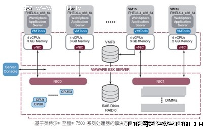 另外,由于電信行業(yè)的特殊性,許多舊的應(yīng)用無法快速有效的部署在新平臺下,造成服務(wù)器利用低,服務(wù)器的數(shù)量越來越多的問題,為此,英特爾與東軟也從幾年前開始進(jìn)行密切合作,在早期的英特爾至強(qiáng)7300、至強(qiáng)7400、至強(qiáng)7500等一系列四路高端服務(wù)器平臺上搭建了虛擬化解決方案,使過去電信舊的應(yīng)用能夠很快在新平臺上進(jìn)行部署。下圖顯示的是東軟以兩臺基于英特爾至強(qiáng) 7500 系列處理器的四路服務(wù)器為基礎(chǔ),構(gòu)建了整個 BSS 架構(gòu):