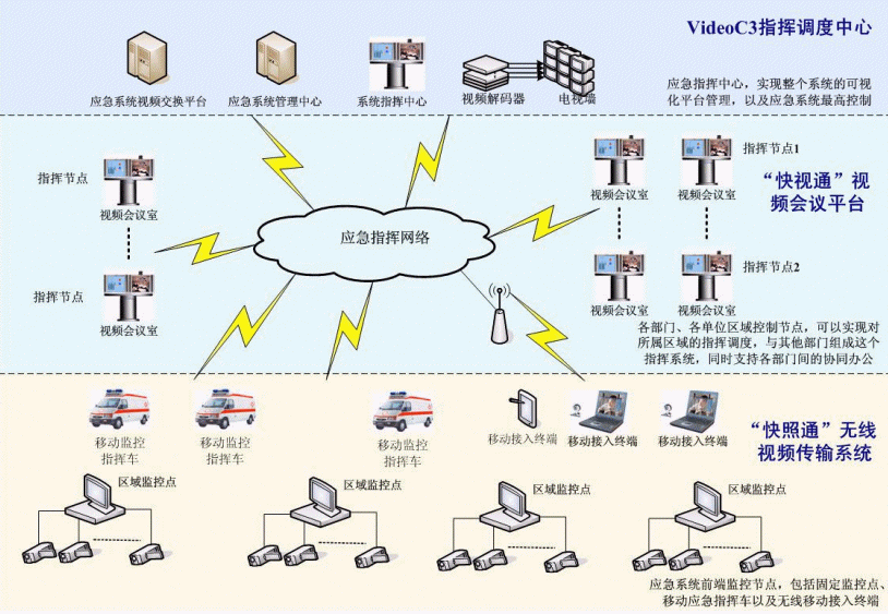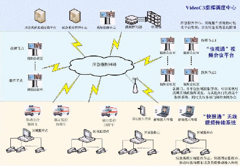 C3I視頻應(yīng)急指揮協(xié)同系統(tǒng)在政府IP網(wǎng)絡(luò)中處于城市的神經(jīng)中樞。它將政府各個部門、單位聯(lián)系成為一個整體。在C3I視頻應(yīng)急指揮協(xié)同系統(tǒng)的前端,由"快照通"無線視頻傳輸系統(tǒng)對政府所屬各個單位進行實時監(jiān)控,時刻掌握現(xiàn)場動態(tài),該部分支持固定點監(jiān)控,也支持移動指揮點和無線移動接入終端,保證了前方工作的靈活、機動性;在系統(tǒng)的指揮中心部分,由VideoC3指揮調(diào)度中心來支持,它一方面需要對前端的監(jiān)控信息進行控制,同時,要對整個政府進行綜合管理調(diào)度,在發(fā)生突發(fā)狀態(tài)的時刻,現(xiàn)場前端"快照通"捕獲的相應(yīng)信息通過C3I系統(tǒng)平臺,迅速傳遞至指揮中心部分,政府管理人員通過VideoC3指揮調(diào)度中心對前端進行遠(yuǎn)程指揮,在第一時間緊急處理現(xiàn)場突發(fā)事件;在整個C3I系統(tǒng)中,政府各個部門、單位之間通過"快視通"視頻會議平臺進行辦公交流,支持各部門間的協(xié)同辦公,同時,也可以通過其實現(xiàn)對所屬區(qū)域的指揮調(diào)度。