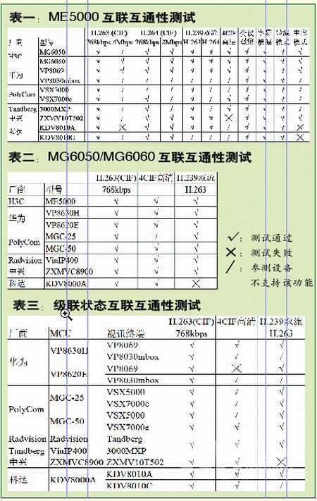 上述3組測試表明,ME5000和MG6050/MG6060能夠與參測的所有產(chǎn)品互聯(lián)互通,并保證絕大部分主流應(yīng)用的正常運行,這充分肯定了研發(fā)部門所做的工作。其實,在第二組測試中,我們將MG6050/MG6060交由其他MCU管理的同時,也加入了所有視訊終端,以便測試這些廠商之間的互聯(lián)互通性。但測試結(jié)果非常不理想,有些甚至無法正常連接。由于缺少這些廠商工程師的支援,我們無法定論它們之間的兼容性問題,但能夠確定的是,前文所提及的H.239雙視頻流傳送、H.264視頻編解碼以及4CIF高清規(guī)格視頻3個特性確實是影響互聯(lián)互通性的關(guān)鍵,廠商如果想改善這個現(xiàn)狀,進行針對性研發(fā)是必需的。