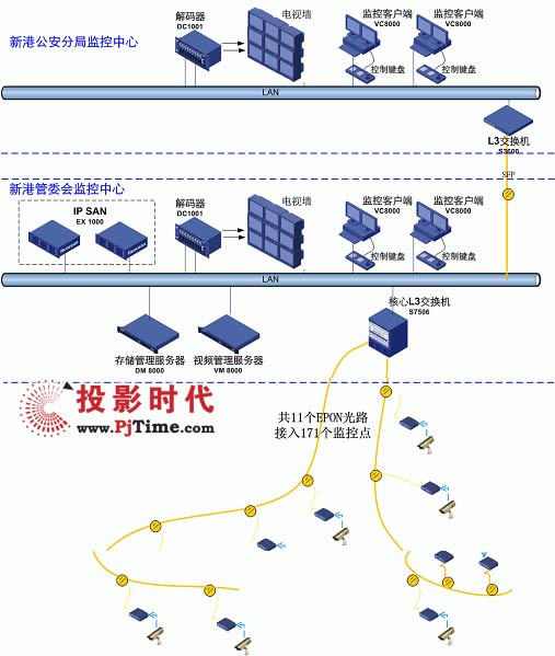 除了攝像頭與圖像顯示設(shè)備之外,整個(gè)監(jiān)控系統(tǒng)主要采用的都是H3C設(shè)備。系統(tǒng)用11(應(yīng)改成10條,最終只用了10條)條EPON光路接入全部171個(gè)監(jiān)控?cái)z像頭;并采用專業(yè)的EX1000存儲(chǔ)產(chǎn)品為120T關(guān)鍵歷史視頻數(shù)據(jù)的提供了高可靠性的存儲(chǔ)保護(hù);而S7506、S3600交換機(jī)優(yōu)化的組播特性和特色的雙流技術(shù)則確保了所有監(jiān)控點(diǎn)的高清晰、高實(shí)時(shí)性、支持大量并發(fā)訪問(wèn)。系統(tǒng)的集中管理、批量配置、全網(wǎng)網(wǎng)管也可以為新港開(kāi)發(fā)區(qū)節(jié)省管理成本。