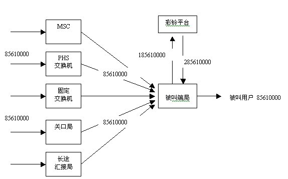 2. 當(dāng)主叫呼叫彩鈴業(yè)務(wù)用戶歸屬的交換機(jī)時時,被叫交換機(jī)判斷這個用戶有"彩鈴屬性"標(biāo)志,并不馬上接通業(yè)務(wù)用戶(被叫),而是在被叫號碼前面加上一個彩鈴平臺的號碼前綴,這樣被叫號碼成了"前綴1+原被叫號碼",然后被叫交換機(jī)把這個新被叫號碼接續(xù)到彩鈴平臺;