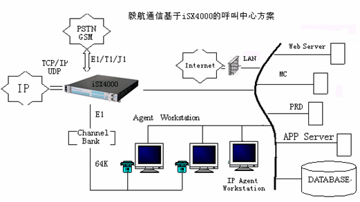 相對(duì)于現(xiàn)在的兩種主流呼叫中心方案,毅航通信基于iSX4000呼叫中心解決方案直接整合了Internet的接入。傳統(tǒng)由IVR完成的操作也可以通過Web頁面上的流程實(shí)現(xiàn),這樣用戶通過下拉菜單、簡(jiǎn)單填寫、點(diǎn)擊按鈕等操作完成客戶識(shí)別、業(yè)務(wù)識(shí)別等操作,這些流程完成后,通過VoIP對(duì)呼叫中心呼入,由呼叫中心對(duì)呼入進(jìn)行受理,再按照相應(yīng)的原則分配到座席,座席再作相應(yīng)的應(yīng)答和處理,從而為客戶提供了一個(gè)通過Web站點(diǎn)直接進(jìn)入呼叫中心的途徑,把Internet所具有的豐富信息資源和強(qiáng)大的功能賦予呼叫中心,它向客戶提供一個(gè)可訪問的Web站點(diǎn),使得呼叫中心從“撥叫到交談(Dial to Talk)”發(fā)展到“點(diǎn)擊到交談(Click to Talk)”,通過Internet可以提供IP電話語音呼叫、Call Back、IP傳真、IM、E-mail等功能,擴(kuò)展了通信渠道,一方面用戶可以實(shí)現(xiàn)免費(fèi)接入到呼叫中心,另一方面企業(yè)能夠向更多的客戶提供優(yōu)質(zhì)、方便的服務(wù)資源,而且由于這些資源的價(jià)格相對(duì)傳統(tǒng)通信便宜,使企業(yè)為客戶提供全國(guó)、乃至于全球服務(wù)成為可能,提高了企業(yè)客戶服務(wù)水平,增強(qiáng)了企業(yè)競(jìng)爭(zhēng)力。毅航通信統(tǒng)一呼叫中心解決方案系統(tǒng)結(jié)構(gòu)如圖所示:
