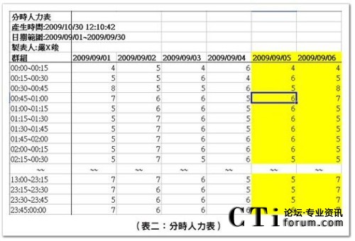 分時人力表在管理上有重要的地位,用于檢視時間內排定的出席人數,通常是將此數據與預測的話務需求做比對,檢查排定人力數與話務曲線的擬合度。在現(xiàn)場管理時,則用于小休調度,避免小休人數過多,使出席人數降到關鍵少數的臨界點下,造成服務水平大幅跌落的狀況發(fā)生。
