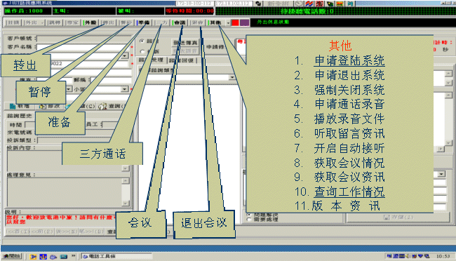 七種不同方式派線策略:隨機、休息最久、平均休息最久、平均最少通次、平均最少通話 、順序、電話操作員優(yōu)先級別