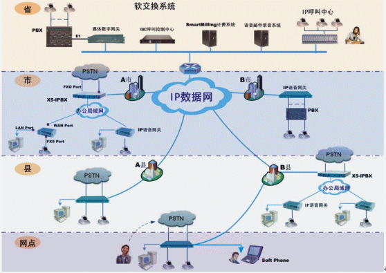在各級辦公機構(gòu)根據(jù)原有用戶數(shù)量,可以配置IP電話綜合接入設(shè)備或IP-PBX,連接當?shù)卦械霓k公電話環(huán)境(程控電話交換機、直線市話、電信虛擬網(wǎng)等)。實現(xiàn)機構(gòu)內(nèi)部辦公電話/傳真通過IP數(shù)據(jù)網(wǎng)通信。同時機構(gòu)以外的長途電話/傳真也可以利用IP電話網(wǎng)傳輸,而不產(chǎn)生任何長途通信費用。