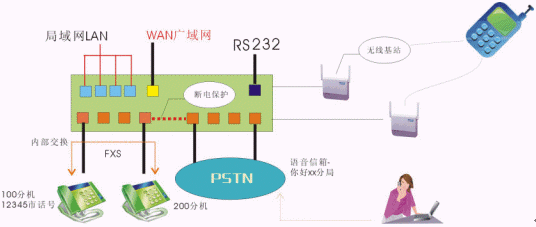 - 同時接入PSTN和專網(wǎng)電話,并在網(wǎng)關(guān)上實現(xiàn)內(nèi)部交換、語音信箱、和PSTN交換等功能