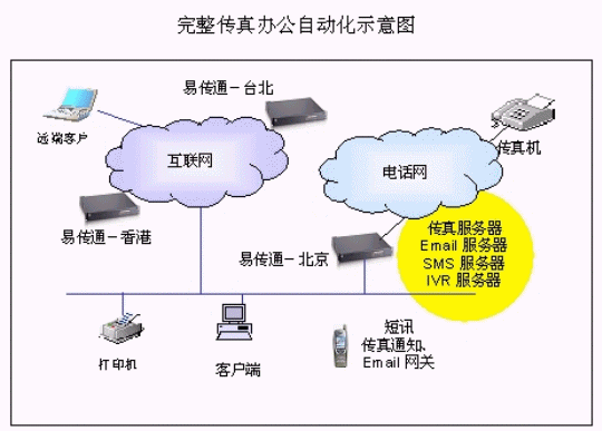 易傳通 網(wǎng)絡傳真服務器是基于網(wǎng)絡的瀏覽器/服務器與客戶端/服務器(B/S 與C/S)設計的,它采用了易傳通 專業(yè)的系統(tǒng)設計,包括國家驗證的專業(yè)傳真軟件系統(tǒng),配上專用的硬件,一體化設計,只需接上網(wǎng)線、電話線,電源,即可使用,用戶無需添加任何其他設備,即可讓您享受網(wǎng)絡傳真帶來的方便、安全、快捷。
