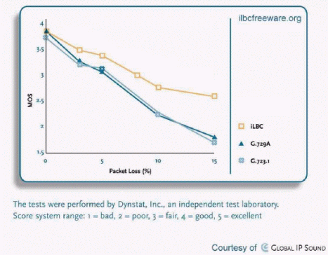 無論在高丟包率條件下還是在沒有丟包的條件下,iLBC的語音質(zhì)量都優(yōu)于目前流行的G.723.1, G.729A等標(biāo)準(zhǔn)編解碼;而且丟包率越大,使用iLBC的語音質(zhì)量優(yōu)勢越明顯。通常情況下,為了衡量IP網(wǎng)絡(luò)語音質(zhì)量,將≥5%丟包率的網(wǎng)絡(luò)情況定義為VoIP的極限網(wǎng)絡(luò)條件。經(jīng)過語音質(zhì)量測試,即使在5%丟包率的情況下,iLBC仍然能夠提供相當(dāng)于GSM手機(jī)的語音質(zhì)量。