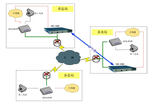 由于用戶數(shù)量較大,我們建議采取分級管理方式,利用我們Anta科技(北京)有限公司Simplicity 系列IP-PBX產(chǎn)品的靈活性,在每個市局放置一臺ME-1000型號的IP-PBX,管理市局及下屬縣區(qū)局的電話系統(tǒng);省總局放置一臺ME-1000,管理總局電話系統(tǒng);同時各市局的ME-1000向總局注冊,形成IP中繼連接,組成全省互通的IP電話管理系統(tǒng)。在終端方面,我們建議采用單端口的ATA-811P桌面型語音網(wǎng)關(guān)連接話機,該網(wǎng)關(guān)通過向IP-PBX注冊,將所有模擬話機連接到VOIP系統(tǒng)中來。