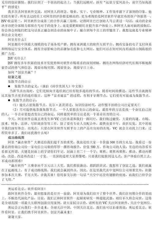 余輝先生在大會上表示,對于整個互聯(lián)網(wǎng)、軟件產(chǎn)業(yè)鏈條來說,在線軟件(SaaS)不但是最熱門的話題,更是順應(yīng)市場需要的新技術(shù)趨勢,中寬網(wǎng)信將和阿里軟件一起,在打造全球“軟件沃爾瑪超市”的過程中發(fā)揮自己的技術(shù)應(yīng)用研發(fā)強項,為全國2億互聯(lián)網(wǎng)網(wǎng)民提供更豐富便利、更低成本的軟件服務(wù)。余輝先生還和與會嘉賓分享了中寬網(wǎng)信和阿里軟件合作過程中的體會和感悟。