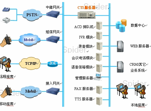 隨著呼叫中心相關(guān)技術(shù)的發(fā)展,呼叫中心的功能日益豐富,其組成結(jié)構(gòu)也日益復(fù)雜。一個完整的呼叫中心可以認(rèn)為由基本部分和擴(kuò)展部分兩部分組成。呼叫中心的基本組成部分為:自動呼叫分配模塊(ACD)、IVR交互式語音應(yīng)答系統(tǒng)、CTI服務(wù)器、錄音、人工座席、班長席、后臺管理系統(tǒng)等;擴(kuò)展模塊包括FAX服務(wù)器、web服務(wù)器、email服務(wù)器及語音信箱、會議電話等功能。