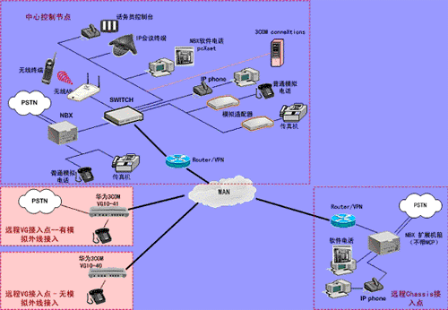 ③.遠(yuǎn)程接入的辦公室不再需要專用的 PBX, 只需要將3Com NBX電話終端接入到WAN網(wǎng)中,就能地實(shí)現(xiàn)在WAN或Internet上與3Com