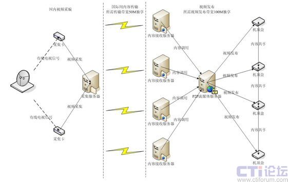 帶寬接入:用于國內(nèi)到國際的出口帶寬,使用大小為50M獨(dú)享,以滿足在有效時間內(nèi)可完成所有內(nèi)容的傳輸;用于國外用戶響應(yīng)發(fā)布的P2P流媒體服務(wù)器出口帶寬為100M,可滿足至少2000并發(fā)用戶的P2P直播點(diǎn)播觀看需求。