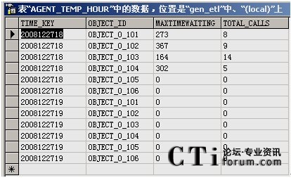 從報(bào)表數(shù)據(jù)庫的相應(yīng)表中,可以看出報(bào)表需要統(tǒng)計(jì)的數(shù)據(jù)信息都以表單形式列出來。圖中的Time Key表示收集數(shù)據(jù)的具體時(shí)刻,object_id表示目標(biāo)對象在配置數(shù)據(jù)庫中存儲的ID號。MaxTimeWaiting和Total_Calls屬性對應(yīng)的是根據(jù)模板項(xiàng)要求統(tǒng)計(jì)的數(shù)據(jù),分別為最大等待時(shí)間和內(nèi)線呼叫總量。下面利用報(bào)表展現(xiàn)工具可以直接將該數(shù)據(jù)展示出來,生成需要的報(bào)表。