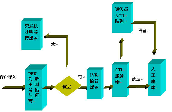 呼入一般都先通過ACD進行排隊,然后根據(jù)用戶選擇進入子系統(tǒng),流程圖如下: