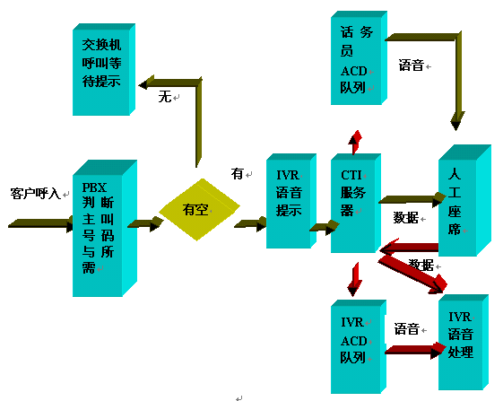 Server,CTI Server控制PBX執(zhí)行轉(zhuǎn)接任務(wù),呼叫進入人工座席ACD隊列排隊,如相關(guān)話務(wù)員有空閑,則執(zhí)行轉(zhuǎn)接操作。同時對于有些服務(wù),根據(jù)需要,CTI
