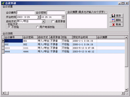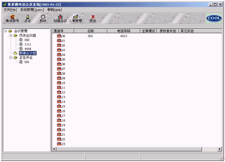 用戶接入:系統(tǒng)啟動(dòng)后,如果用戶電話呼入,則系統(tǒng)自動(dòng)接聽,并提請(qǐng)用戶輸入密碼校驗(yàn)后進(jìn)入會(huì)議系統(tǒng)。也可'集體撥號(hào)'、'單個(gè)撥號(hào)''點(diǎn)名'