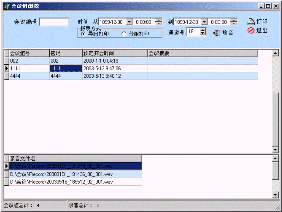 可對(duì)歷史會(huì)議記錄進(jìn)行管理,查看記錄內(nèi)容幾錄音文件(WAV文件格式),以便回放調(diào)聽,可對(duì)報(bào)表進(jìn)行導(dǎo)出或打印操作