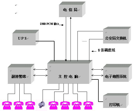 電信局交換機(jī)提供單獨(dú)數(shù)字2MB PCM中繼接口,通過(guò)HDSL傳輸設(shè)備或光端機(jī)設(shè)備將中繼接口連接到公安局指揮中心。若電信局與公安局距離小于500米,則可直接使用75歐姆電纜將中繼接口連接到公安局指揮中心。 該數(shù)字2MB PCM中繼接口的數(shù)據(jù)可以作成110/119/122混合編程,數(shù)據(jù)采用收全碼方式,被叫控制掛機(jī)。