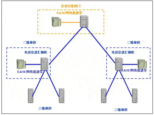 當(dāng)前國(guó)內(nèi)許多行業(yè)由于行業(yè)的業(yè)務(wù)特點(diǎn),在原有的電話網(wǎng)應(yīng)用中,電話會(huì)議作為常用的交流手段發(fā)揮著重要作用。這些行業(yè)的電話會(huì)議業(yè)務(wù),主要是通過(guò)電話會(huì)議匯接機(jī)的方式實(shí)現(xiàn):會(huì)議召集單位通過(guò)電話會(huì)議匯接機(jī)(以下簡(jiǎn)稱匯接機(jī))通過(guò)專線、撥號(hào)等方式連通下級(jí)單位(以下簡(jiǎn)稱二級(jí)單位)的匯接機(jī),二級(jí)單位的匯接機(jī)通過(guò)專線、撥號(hào)等方式連通所轄單位(以下簡(jiǎn)稱三級(jí)單位)的會(huì)場(chǎng)電話。這樣通過(guò)多級(jí)匯接機(jī)級(jí)連的方式實(shí)現(xiàn),主持單位和二、三級(jí)單位間的電話網(wǎng)連通,利用匯接機(jī)實(shí)現(xiàn)廣播、三方通話、調(diào)度發(fā)言單位等會(huì)議功能。