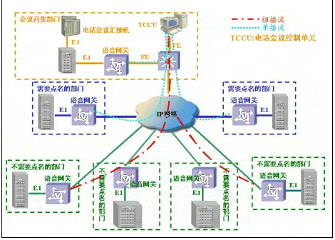 采用原有的會(huì)議電話架構(gòu),只是話音的長(zhǎng)途連接由模擬專線等改為IP傳輸。方案由于采用原有電話會(huì)議匯接機(jī),保護(hù)了用戶的原有投資。缺點(diǎn)是在召開多級(jí)會(huì)議電話時(shí),由于語(yǔ)音信號(hào)首先在召集單位語(yǔ)音網(wǎng)關(guān)進(jìn)行壓縮,經(jīng)IP傳輸后,在二級(jí)單位語(yǔ)音網(wǎng)關(guān)解壓縮還原為模擬話音,再經(jīng)二級(jí)單位的語(yǔ)音網(wǎng)關(guān)二次壓縮,經(jīng)IP網(wǎng)傳輸后,在三級(jí)單位的語(yǔ)音網(wǎng)關(guān)上二次解壓縮,導(dǎo)致語(yǔ)音信號(hào)多次壓縮/還原,對(duì)語(yǔ)音質(zhì)量損傷較大。