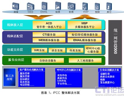 IPCC(IP聯(lián)絡中心IP Contact center)是針對金融、政府、IT和電子商務、物流、制造、緊急救援等行業(yè)的特點,推出的一體化多媒體聯(lián)絡中心解決方案。結合電話、FAX、E-mail、Web、視頻、短信等多種通訊手段,建立客服、銷售及市場推廣的高效溝通渠道。
