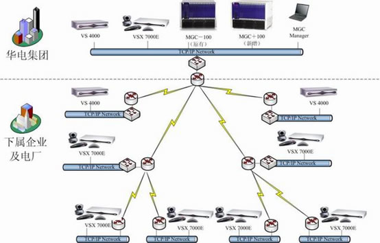 華電集團(tuán)領(lǐng)導(dǎo)十分重視電力信息化及華電集團(tuán)電子政務(wù)的建設(shè)工作。為了貫徹國務(wù)院對政府系統(tǒng)信息化建設(shè)的要求,實(shí)現(xiàn)華電集團(tuán)政務(wù)辦公和行業(yè)管理信息服務(wù)的電子化、網(wǎng)絡(luò)化,滿足華電集團(tuán)建立辦事高效、運(yùn)轉(zhuǎn)協(xié)調(diào)、行為規(guī)范的行政管理體制的要求,加快推進(jìn)電力行業(yè)信息化建設(shè),華電集團(tuán)決定開展華電集團(tuán)信息化建設(shè)二期工程建設(shè),即在現(xiàn)有的基礎(chǔ)上再增加一臺MCU以及在下屬企業(yè)及電廠增加37臺終端。鑒于POLYCOM在視頻會議強(qiáng)大的技術(shù)優(yōu)勢以及神州數(shù)碼在視頻會議系統(tǒng)建設(shè)和實(shí)施上的雄厚實(shí)力和豐富經(jīng)驗,華電集團(tuán)決定包括MCU和終端的所有設(shè)備都采用POLYCOM的產(chǎn)品。整個系統(tǒng)主要建立在華電集團(tuán)現(xiàn)有的視頻會議的基礎(chǔ)之上,依據(jù)H.323標(biāo)準(zhǔn)協(xié)議建設(shè)視頻會議系統(tǒng)二期組網(wǎng)。其中,控制中心新增一臺POLYCOM公司的MGC+100多點(diǎn)控制單元(即MCU);POLYCOM 高性能的VSX7000E作為下屬企業(yè)及電廠主接點(diǎn)視頻會議終端。