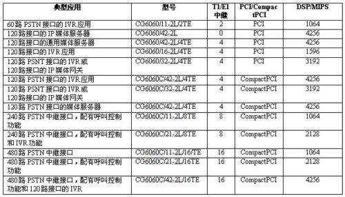 Call ControlTM(NCC)。CG 6060 PCI板卡和CG 6060C CompactPCI板卡是研制經(jīng)濟型應(yīng)用系統(tǒng)的理想選擇,可研制的應(yīng)用系統(tǒng)類型包括:媒體服務(wù)器、增強服務(wù)平臺、IVR、會議應(yīng)用、消息處理、IP集中交換解決方案等。