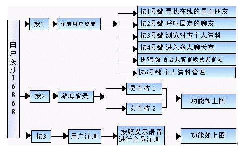 系統(tǒng)用戶可以通過(guò)撥打固定電話、小靈通實(shí)現(xiàn)語(yǔ)音聊天交流;可以通過(guò)系統(tǒng)服務(wù)收聽(tīng)聊友給自己的留言;給任何聊友留言;參與主題聊天;通過(guò)聊友速配與聊友聊天;系統(tǒng)還提供查詢、幫助功能,以方便用戶更好的使用系統(tǒng)業(yè)務(wù)。