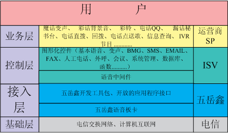 依靠五岳鑫公司強大的技術(shù)優(yōu)勢和對增值業(yè)務(wù)的深刻理解,以我公司自主研發(fā)的具有國際先進水平的語音板卡為基礎(chǔ),為廣大增值業(yè)務(wù)服務(wù)商提供的語音增值業(yè)務(wù)綜合平臺,將種類繁多的語音增值業(yè)務(wù)融合在一個系統(tǒng)平臺中。不僅支持行業(yè)內(nèi)大多數(shù)的語音增值業(yè)務(wù),還能方便、快速地面向市場提供各種的語音增值業(yè)務(wù)。