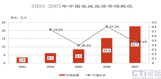 根據(jù)Iresearch的數(shù)據(jù),2007年,中國在線旅游市場規(guī)模達到22.7億元,比06年同比增長47.5%;其中攜程以56.3%的市場份額繼續(xù)領跑,比06年的54.2%增長了2個百分點。與此相對比的是,美國三強旅游網(wǎng)站之一的Travelocity,在06年第一季度的全球營收就達到了24億美金。具體情況如下圖所示: