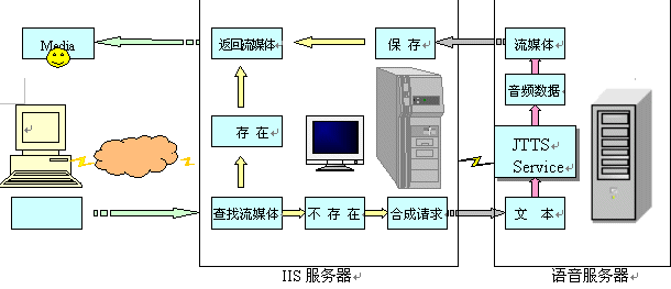 語音服務器方案是指利用捷通華聲在CTI領域成熟應用的jTTS Service語音服務器,增加一臺或多臺語音服務器到現(xiàn)有的IIS服務系統(tǒng)的網(wǎng)絡環(huán)境中;在IIS服務器中,增加訪問語音服務器的功能。當IIS服務器需要流媒體輸出時,向語音服務器發(fā)出請求,語音服務器接受IIS服務器的請求,并對請求的數(shù)據(jù)進行合成、格式轉換,得到流媒體后返回給IIS服務器,IIS服務器再將此流媒體傳輸給用戶。