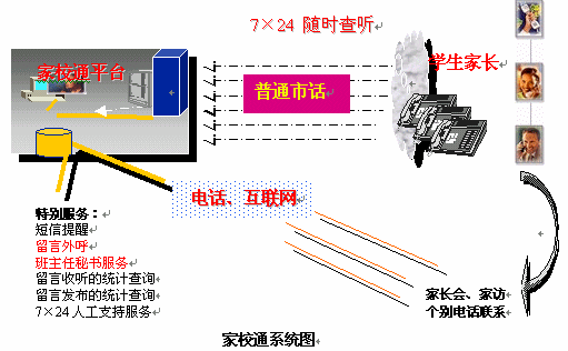 捷通華聲從關(guān)愛(ài)青少年成長(zhǎng)出發(fā),提出了應(yīng)用于教育領(lǐng)域溝通平臺(tái)"家校通"系統(tǒng)的語(yǔ)音服務(wù)解決方案。家校通系統(tǒng)是一個(gè)融合了語(yǔ)音合成、計(jì)算機(jī)網(wǎng)絡(luò)集成綜合服務(wù)、互聯(lián)網(wǎng)、數(shù)據(jù)庫(kù)等多種先進(jìn)IT技術(shù)為一體的新一代家校聯(lián)系工具。它充分利用互聯(lián)網(wǎng)與目前最為普及的公眾電話(huà)等資源,為學(xué)校提供多樣化的信息發(fā)布渠道,同時(shí)強(qiáng)大的7×24小時(shí)的留言發(fā)布和查聽(tīng)服務(wù)功能,為老師和家長(zhǎng)提供一種全新、高效、便捷的交流方式,大大提高了家長(zhǎng)的滿(mǎn)意度,提升了學(xué)校的管理實(shí)力。