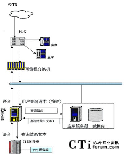 用戶可以通過電話提交他的查詢請(qǐng)求(比如使用按鍵方式,提交個(gè)人卡號(hào)等),IVR服務(wù)器收到請(qǐng)求后會(huì)向其他應(yīng)用服務(wù)器提交此查詢請(qǐng)求,當(dāng)IVR得到查詢結(jié)果后,他會(huì)將文本形式的查詢結(jié)果交給jTTS服務(wù)器,jTTS服務(wù)器會(huì)返回查詢結(jié)果的語音形式,最終語音會(huì)在坐席上播放,用戶就可以聽到他剛才所要查詢的信息。