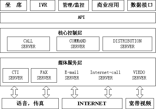 核心控制層由Call Server(呼叫控制) 、Command Server(命令服務(wù))、Distribution Server(路由服務(wù)) 組成。Call Server用于管理呼叫信息,維護整個系統(tǒng)呼叫的狀態(tài)機;Command Server負責(zé)命令的接收和轉(zhuǎn)發(fā);Distribution Server完成路由功能。