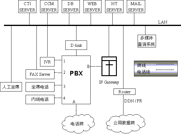 上圖所示的分布于不同地區(qū)的多個系統(tǒng)可以互相聯(lián)接,構(gòu)成分布式客戶服務(wù)中心,如地市話務(wù)員回答不了客戶的問題,可轉(zhuǎn)接到省中心,話務(wù)員在坐席上操作請求CCM轉(zhuǎn)接省中心,CCM通過CTI SERVER控制PBX將A與B接通,IP網(wǎng)關(guān)響應(yīng)呼叫,將電話號碼信號翻譯成相關(guān)的IP地址,將線路上的語音信號處理成數(shù)據(jù)信息并打包,通過本地LAN、本地ROTUER、公用數(shù)據(jù)網(wǎng)、省中心LAN等發(fā)送到省中心的IP網(wǎng)關(guān)、呼叫到達(dá)省中心PBX的B,按省中心系統(tǒng)的排隊(duì)和選擇坐席的規(guī)則選擇坐席,省中心的IP網(wǎng)關(guān)將接收到的數(shù)據(jù)解包還原成語音信號通過B送坐席電話3,雙方通話。這樣全省各市縣將聯(lián)結(jié)成一個大的分布式呼叫中心,同時IP電話也可用于企業(yè)內(nèi)部通信,通信費(fèi)將降至原來的一半以下。