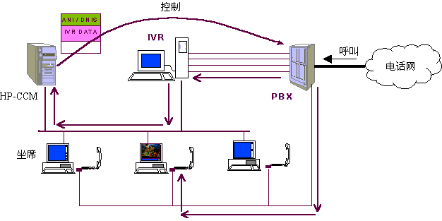 在任何一個步驟中,如客戶選擇了人工坐席,則IVR請求CCM根據(jù)多種情況選擇一個空閑坐席(選擇方法見下文)并控制PBX將呼叫與選擇的人工坐席接通,同時系統(tǒng)在客戶對IVR操作的過程中,已經(jīng)幀測到了客戶所使用的電話號碼、客戶的按鍵信息,系統(tǒng)還記錄有客戶上次的呼叫情況等數(shù)據(jù),這些數(shù)據(jù)基本上可以確定客戶大體關(guān)心的問題,對于老客戶甚至可以初步認(rèn)定呼叫者的身份、年齡、性別、業(yè)務(wù)辦理情況等,因此,話務(wù)員在與客戶談話之前就已經(jīng)了解了相當(dāng)多的信息,并控制選定的坐席屏幕顯示有關(guān)客戶信息,便于直接進(jìn)入正題,提高了效率?蛻襞c坐席的交流過程中,坐席可通過終端請求CCM控制PBX將本次呼叫與其他話務(wù)員(坐席)、專家或業(yè)務(wù)辦公室(如內(nèi)線電話)等接通,當(dāng)坐席人員將呼叫轉(zhuǎn)移到另一坐席或?qū)<視r,系統(tǒng)將在本呼叫中收集的各類數(shù)據(jù)同時轉(zhuǎn)向下一坐席電腦。在坐席人員解答客戶問題時,可將問題及解答情況收集,便于分析坐席人員的業(yè)務(wù)素質(zhì)和問題傾向,從而有針對性地培訓(xùn)坐席人員。對于客戶來講,他可以通過電話按鍵在話務(wù)員、自動語音、傳真、專家和業(yè)務(wù)辦公室之間漫游,系統(tǒng)將記錄客戶漫游的路徑,對于設(shè)計(jì)較好的菜單和路經(jīng)來說,客戶的漫游路徑基本上可以反映出其需求,大量客戶的漫游路徑無疑將反映出市場需求。