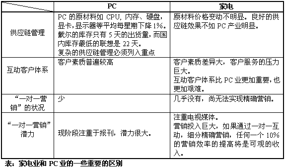 聯想長期構筑的、在中國PC制造業(yè)的核心競爭力,正受到戴爾的巨大威脅,導致聯想開始轉而采用戴爾的按客戶需求定制、直接銷售的模式,希望建立新的核心競爭力,再度引領中國PC產業(yè)。IT制造業(yè)的巨變,戴爾的成功給陷于低層次競爭的家電產業(yè)很大的啟發(fā),曾經鑄造中國家電企業(yè)輝煌的核心競爭力急需注入新的生命力,以適應新的競爭形勢。計算機技術、互動通信技術的進步以及互聯網的出現使企業(yè)能夠建立與用戶之間一對一的密切客戶關系,使服務創(chuàng)造價值,IT技術推動技術、產品、生產、銷售和營銷的發(fā)展,支撐家電企業(yè)建立新的核心競爭力。在同質化競爭的環(huán)境下,家電企業(yè)也許更應該從服務、營銷、銷售方面來建立自己的核心競爭力。海爾就是典型的例子,海爾的發(fā)展與它完善的服務體系和服務制度是分不開的。聚焦于服務、營銷、銷售的客戶關系管理(CRM)系統(tǒng)讓家電企業(yè)看到了新的希望?梢灶A言,CRM將為家電業(yè)點燃一盞新啟航燈。