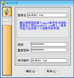 DICO下載后的安裝過(guò)程比較簡(jiǎn)單: "接收協(xié)議"后一路"下一步"就OK了。然后是注冊(cè),過(guò)程也委簡(jiǎn)單:運(yùn)行后,第一次使用時(shí)點(diǎn)"注冊(cè)"(以后使用時(shí)只要輸入用戶(hù)名或密碼登錄就是了),隨后的"用戶(hù)注冊(cè)"窗口中填寫(xiě)好相關(guān)的選項(xiàng)后點(diǎn)"確定"(下圖2)就OK了!