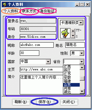 、冱c(diǎn)按"個(gè)人資料"命令(圖3的B1處),彈出"個(gè)人資料"修改窗口,包括"個(gè)人資料/聯(lián)系方式/身份驗(yàn)證"這三大類(lèi)選項(xiàng)卡。其中:"個(gè)人資料"選項(xiàng)卡下,除登錄名、號(hào)碼和身份這三項(xiàng)不可更改外,其余各項(xiàng)都是可填或可選項(xiàng),據(jù)你所需進(jìn)行修改就是了(下圖4)。另外,還有"聯(lián)系方式"和"身份驗(yàn)證"兩大選項(xiàng),怎么個(gè)用法自己點(diǎn)開(kāi)一看就明白了你!