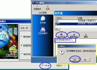 3、點(diǎn)按主窗口下方的"覓友"按鈕,彈出的對(duì)話(huà)框中選擇三種添加方式之一后按"下一步"進(jìn)行好友的添加;當(dāng)有人加你為好友時(shí),系統(tǒng)會(huì)有提示音閃并DICO圖標(biāo)在任務(wù)欄不斷閃爍,你點(diǎn)擊上來(lái)后會(huì)彈出你的DICO郵箱對(duì)話(huà)框并收到有某某加你為好友的消息,此時(shí)可先點(diǎn)按"查看資料"了解一下來(lái)人相關(guān)信息;若有意可點(diǎn)按"加產(chǎn)好友"加來(lái)訪(fǎng)者為好友(下圖7)。