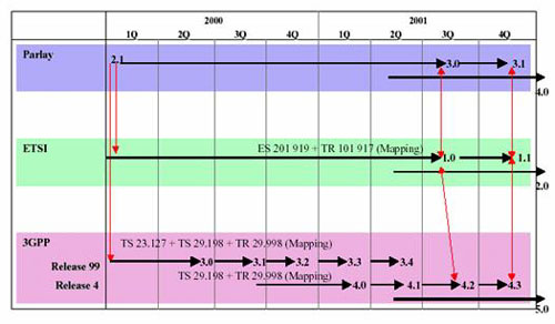 API規(guī)范。這些組織主要包括ITU-T、ETSI、IEEE、IETF、3GPP、OMG、TINA-C、Softswitch論壇、JAIN等。目前,Parlay工作組、ETSI和3GPP已經(jīng)聯(lián)合起來,共同發(fā)展Parlay協(xié)議。圖2為3個標(biāo)準(zhǔn)組織發(fā)布的Parlay版本的對應(yīng)關(guān)系。