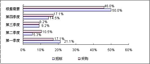 賽迪顧問(wèn)針對(duì)視頻會(huì)議終端系統(tǒng)用戶招標(biāo)與采購(gòu)的調(diào)查表明,用戶招標(biāo)與采購(gòu)的季節(jié)性差異比較明顯,除了將近50%的用戶會(huì)根據(jù)需要在不確定的時(shí)間里進(jìn)行招標(biāo)和采購(gòu)以外,第一季度和第四季度成為用戶招標(biāo)和采購(gòu)相對(duì)集中的時(shí)間段,這與許多其他商用IT產(chǎn)品的采購(gòu)類似。具體到招標(biāo)和采購(gòu)的月份,10月份成為最為集中的時(shí)間。原因在于,視頻會(huì)議終端系統(tǒng)的采購(gòu)受行業(yè)用戶的資金規(guī)劃與使用的影響顯著。第一季度往往是各企事業(yè)單位資金充裕的時(shí)期,到了第四季度又是政府部門為完成本年度信息化建設(shè)的任務(wù),往往產(chǎn)生比較集中的設(shè)備采購(gòu)。