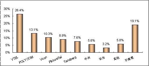 在無(wú)提示情況下,被調(diào)查者首先想到的視頻會(huì)議終端系統(tǒng)的品牌分布情況,即品牌第一提及率指標(biāo),可以反映出各品牌被用戶認(rèn)知的廣泛程度。賽迪顧問(wèn)調(diào)查數(shù)據(jù)顯示,第一提及率最高的品牌是VTEL,支持率達(dá)到26.4%,比處于第二位的品牌高出13.3個(gè)百分點(diǎn);其次是POLYCOM和Vcon,支持率達(dá)到13.1%和10.3%。(見圖5)
