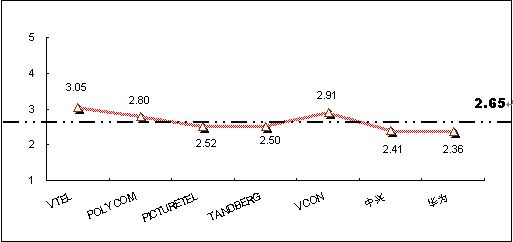為深入了解和對(duì)比被調(diào)查者對(duì)不同品牌視頻會(huì)議終端系統(tǒng)產(chǎn)品的認(rèn)知程度,本次調(diào)查將被調(diào)查者對(duì)各主要品牌的了解程度劃分為五個(gè)檔次,對(duì)不同的檔次賦予不同的分值,分別為“非常了解(5分)”、“了解(4分)”、“一般(3分)”、“不了解(2分)”、 “非常不了解(0分)”,同時(shí)綜合考慮以購(gòu)買用戶擁有的品牌分布,借以比較不同品牌在認(rèn)知度上的差異。統(tǒng)計(jì)結(jié)果顯示,目前在中國(guó)市場(chǎng)上,用戶對(duì)主要視頻會(huì)議終端系統(tǒng)產(chǎn)品品牌的了解程度的平均值為2.65,各品牌認(rèn)知度分值見圖6。其中:VTEL品牌的知名度最高,指標(biāo)值為3.05,超過(guò)了“一般”了解水平;其次為VCON品牌,指標(biāo)值為2.91;POLYCOM的知名度指標(biāo)值為2.8,處于第三位。除VTEL品牌外,其他主要品牌的知名度還都處于低于“一般”了解水平階段,反映出產(chǎn)品的市場(chǎng)認(rèn)知還較低。
