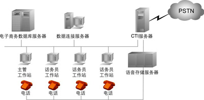 中型呼叫中心:座席代表在50~100之間。據(jù)專業(yè)數(shù)據(jù)統(tǒng)計(jì)公司預(yù)測(cè),中型系統(tǒng)需求量最大,因此不少呼叫中心軟、硬件開(kāi)發(fā)商對(duì)準(zhǔn)這一目標(biāo)進(jìn)行開(kāi)發(fā)。這種系統(tǒng)結(jié)構(gòu)相對(duì)簡(jiǎn)單,投資也少,容易被中、小企業(yè)所接受。目前我國(guó)的一些公司開(kāi)發(fā)系統(tǒng)多屬于此種類型。它可以省掉大型交換機(jī)的投資,而利用PBX與CTI服務(wù)器和業(yè)務(wù)代表座席直接相連,業(yè)務(wù)代表席同時(shí)與應(yīng)用服務(wù)器相連,客戶資料也存在應(yīng)用服務(wù)器中,可實(shí)時(shí)地將接入電話的客戶姓名自動(dòng)在計(jì)算機(jī)屏幕上彈出。CTI服務(wù)器一般由CTI硬件開(kāi)發(fā)商的板卡和PC組成,其擴(kuò)容和增加功能也比較方便,成本也低,因此是一種投資小、見(jiàn)效快、升級(jí)也很靈活的系統(tǒng)。